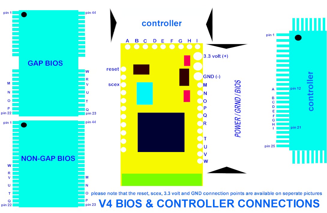 and the associated points on the Bios and Controller chips. Use this diagram